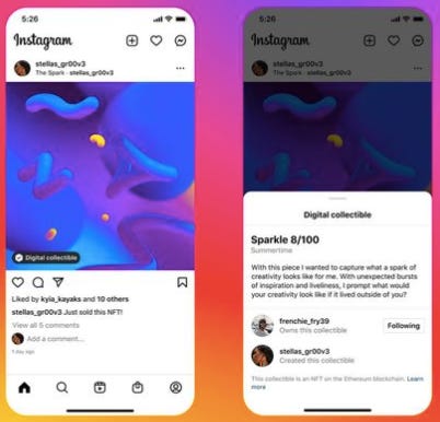 Similar functionality is coming to Facebook soon, along with augmented reality NFTs on Instagram Stories via Spark AR so you can place digital art into physical spaces.